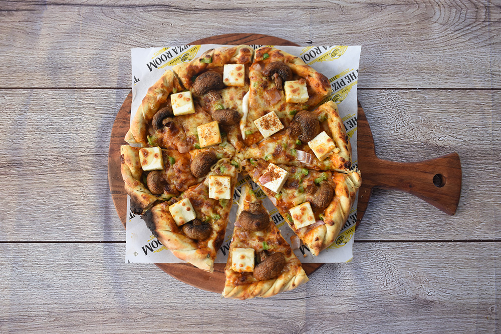 It’s a Bahubali Pizza of the Pizza Room it’s included with premium exotic toppings of Paneer, mushroom and babycorn with Fresh capsicum, onion and Puree tomato with mozzarella cheese.